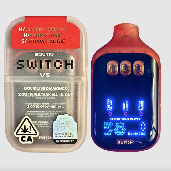 Introducing the exquisite Cherry Gelato x Fruit Stripe x Straw Tangie Boutiq Switch V5 Disposable, a masterpiece of flavor. This cutting-edge device offers a substantial 2G of premium extract. It incorporates a sophisticated triple-chamber design for flexibility. Now, savor three distinct and potent strains immediately. Enjoy the creamy Cherry Gelato and the sweet Fruit Stripe. Furthermore, taste the zesty, bright Straw Tangie. This highly versatile 2G Vape Pens option delivers unparalleled customization.