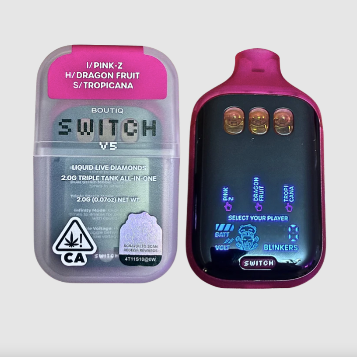 The strategic combination of an Indica (Pink Z), a balanced Hybrid (Dragon Fruit), and a Sativa (Tropicana) creates a multifaceted experience. The Boutiq Switch V5 is renowned for its high potency. Thus, users experience a strong, fast-acting onset.